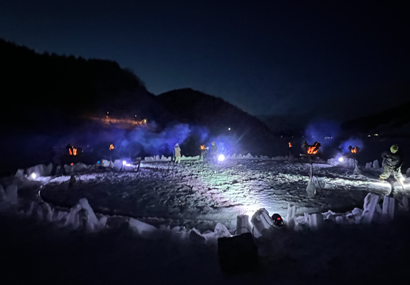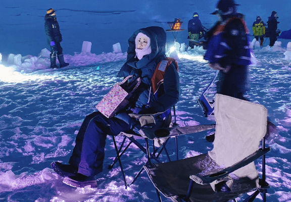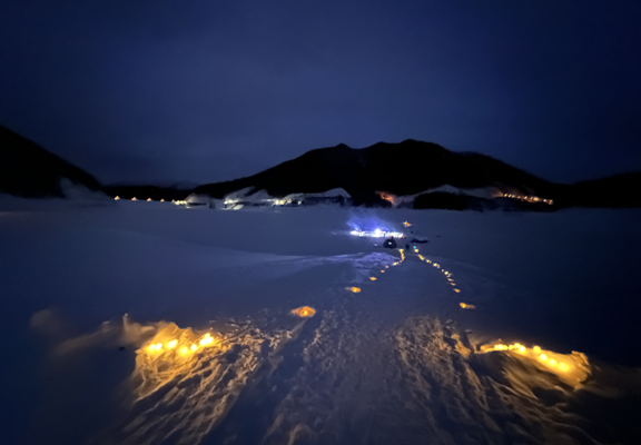 夜間はライトアップされた氷上、白銀に包まれた夜空を眺めながら、