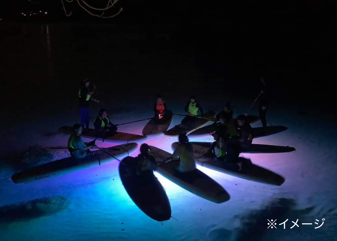 LED照明を装備したSUPで楽しむナイトクルーズと夕暮れから夜空に広がる満点の星空等、大自然体験ができるナイトタイムエコノミーパッケージツアー。