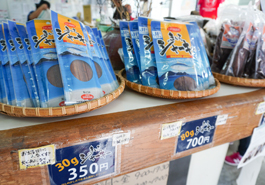 お土産としても人気の「まぐろジャーキー」の製造元。直売所では、ジャーキーのほかマグロの佃煮など加工食品が購入できる。