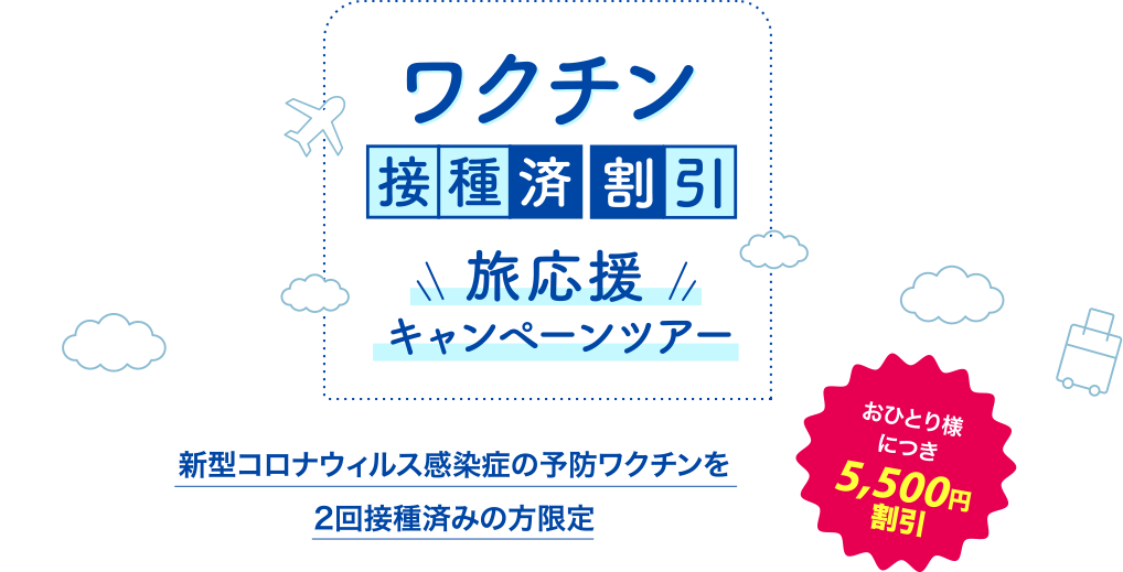 「新型コロナウィルスワクチン接種証明書または接種済証」をご提出いただけないお客様については割引対象外となりますので、割引前の旅行代金をお支払いいただくことになります。