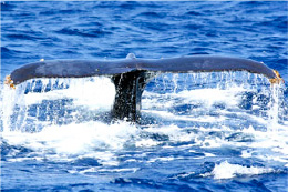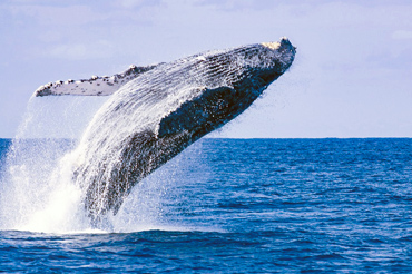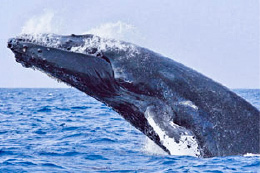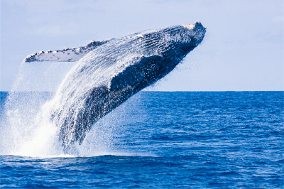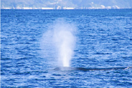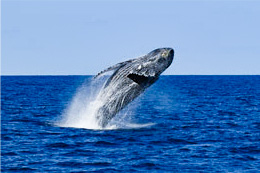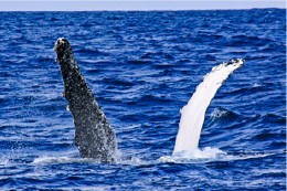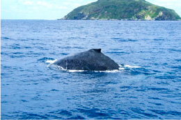 繁殖のためにケラマの海にやってきます。繁殖の時期にはオスが求愛行動として様々なダイナミックなパフォーマンスを見せてくれます。クジラは頭の上に鼻があり、水面に出して呼吸するために海面に浮上します。これをブローといい、白く霧状となったブローは5mぐらいまで吹き上がります。